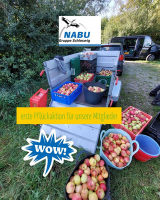 10 NABU Ortsgruppen-Mitglieder folgten unserem Aufruf und pflückten und sammelten rein ökologisch gewachsene Äpfel auf unserer Streuobstwiese am Haferteich. Herzlichen Dank allen Helferinnen und Helfern!!Gegen eine Spende für den NABU Schleswig konnten die gepflückten Äpfel mit nach Hause genommen werden. Die gesammelten Äpfel wurden zur Mosterei gefahren werden.